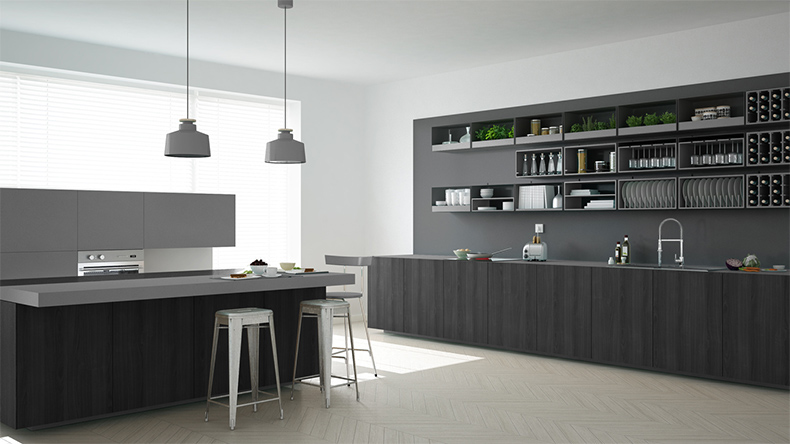 Grey interiors can sometimes be slightly harsh and industrial looking, so adding some organic textures is important. Fitting your kitchen with some light wood flooring or units can help break up the grey, giving your space a more natural touch which will help it feel more inviting.