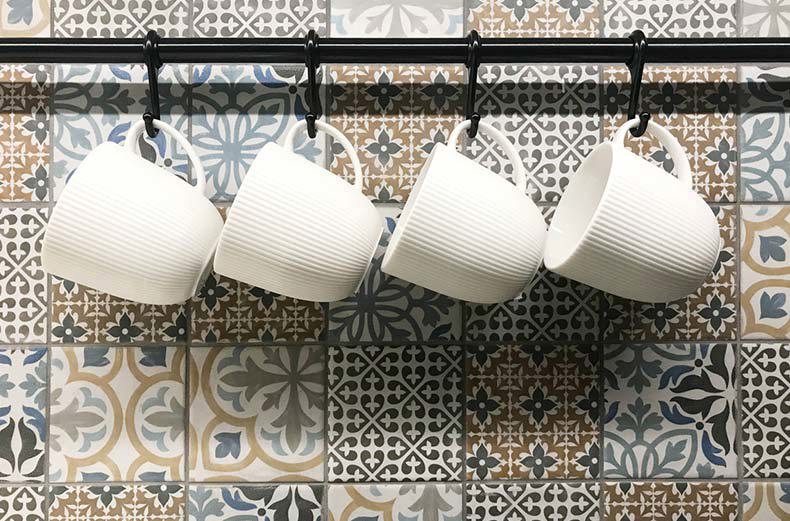 If you're struggling for cupboard space to store all your favourite mugs, why not add some mug hooks to your wall? Hanging items can give your kitchen a charming, rustic feel and your choice of mugs can become part of the kitchen decor itself! We love the vintage hooks used here, particularly when paired with the vibrant tiles in the background.