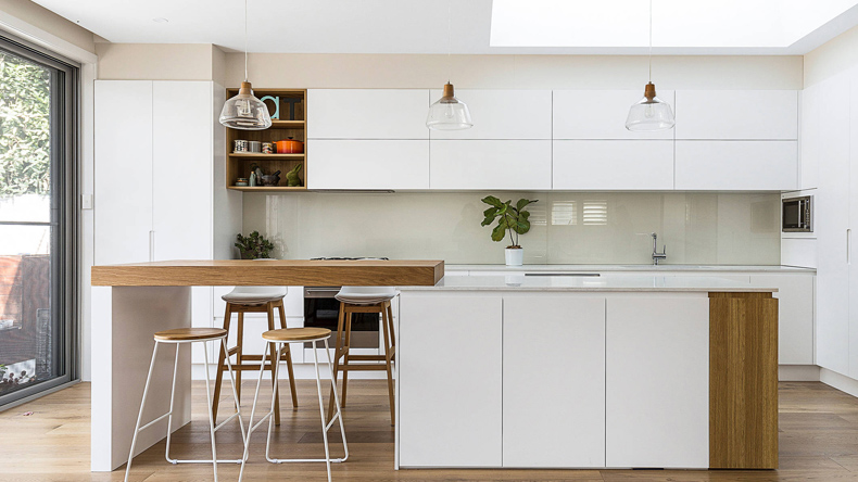 White will be the main colour throughout your Scandinavian kitchen but that doesn’t mean your walls have to be boring. You can add a white tiled section for texture or use a different coloured kitchen splashback. We like the wood panelling used in the image below which brings a fresh, natural touch of colour to the kitchen.