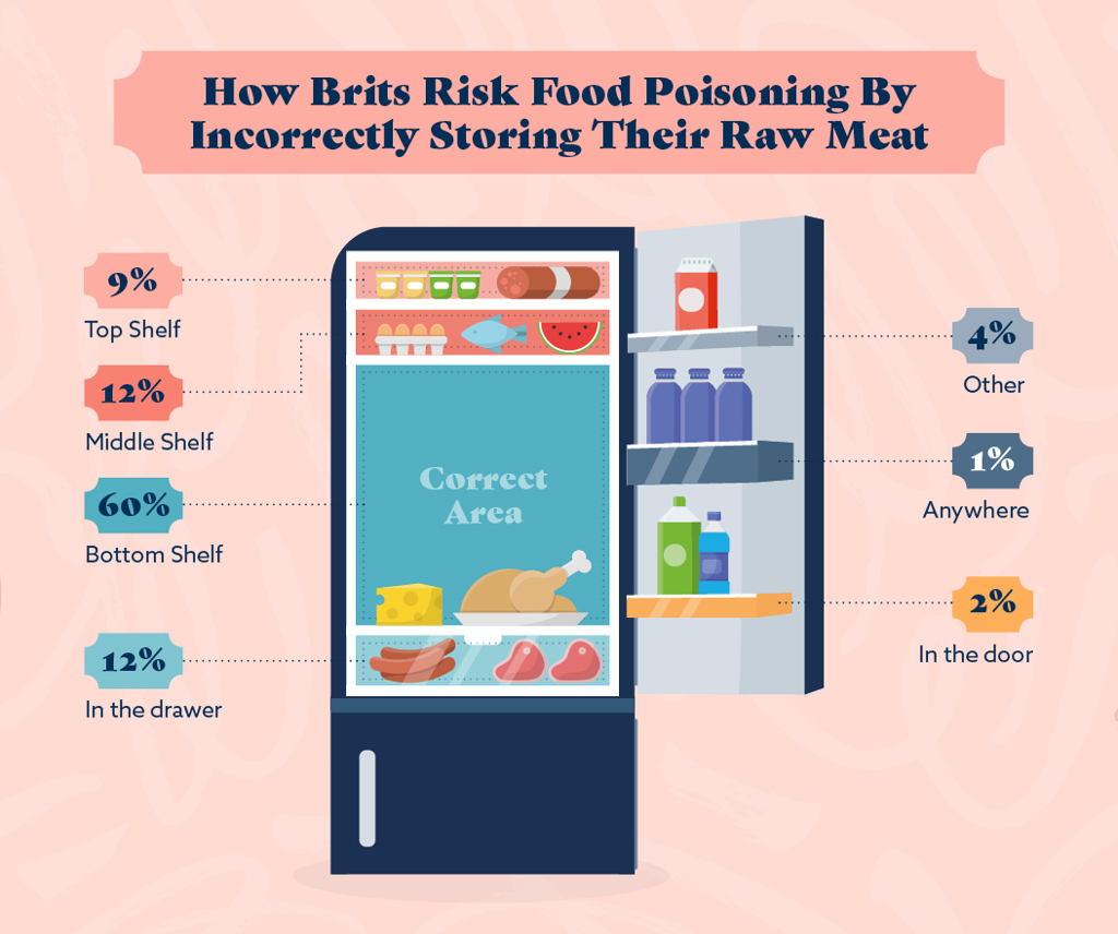 However, our survey has revealed that a staggering 2/5 (40%) of Brits do not store their raw meat, poultry, and fish on this shelf.